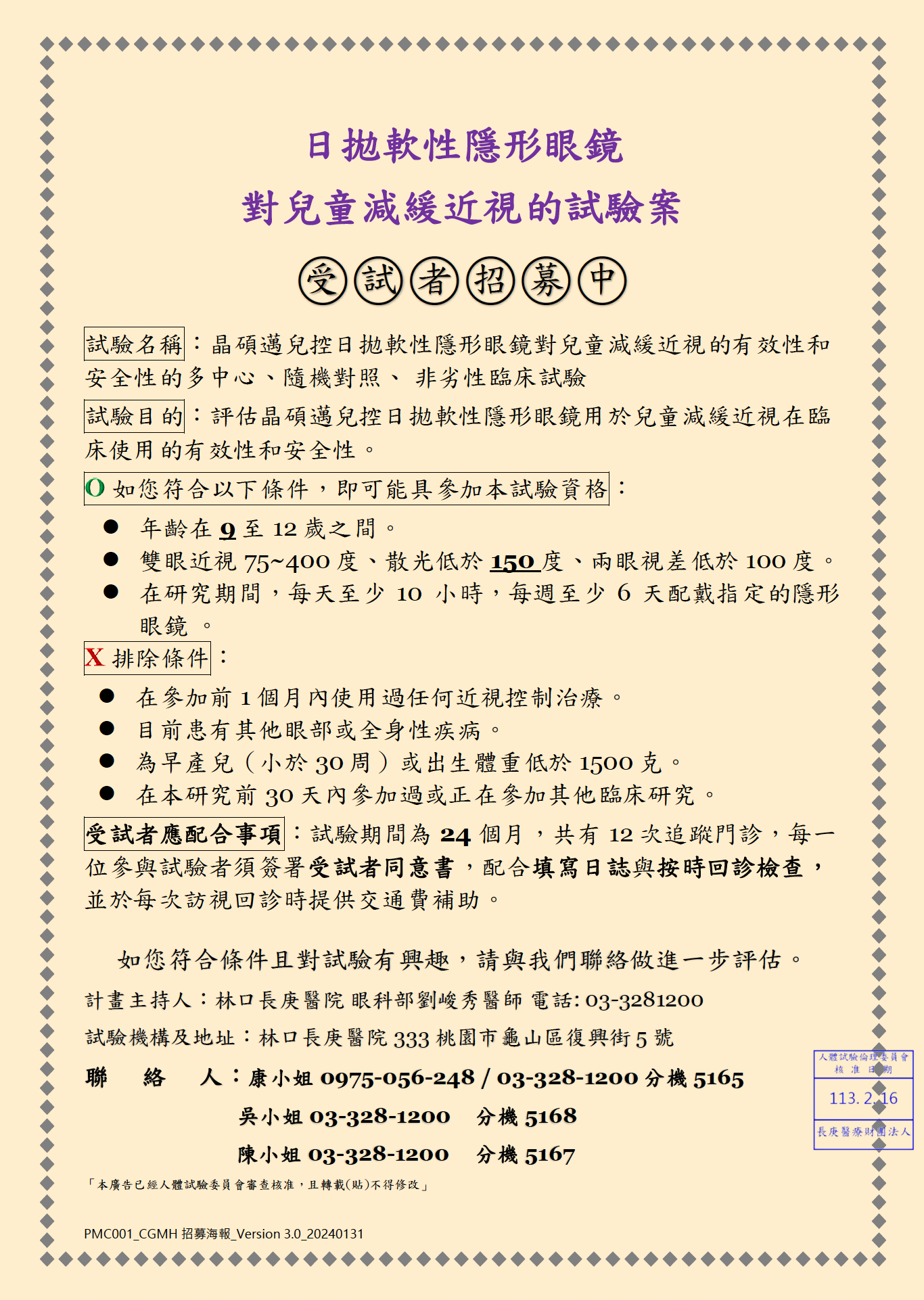 計畫主持人:林口長庚醫院 眼科部劉峻秀醫師 電話: 03-3281200